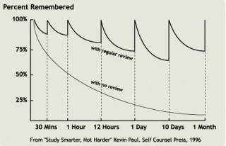 Figure 1, below illustrates very clearly why recycling is important. The human rate of forgetting is such, that we already lose around 25% of what we attempt to commit to memory 30 minutes after having rehearsed it in Working Memory (henceforth WM). Seven days later, if no regular reinforcement has occurred, we will have lost 80 % of it. One month later, we will have forgotten virtually everything. That is why distributed practice is important and constitutes a more powerful way to consolidate memory than massed practice (i.e. better four sessions of 15 minutes a week every other day, than two sessions of thirty minutes two days away from one another ).