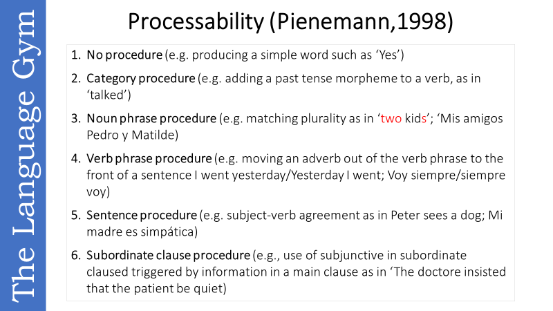 Figure 6: Manfred Pienemann’s developmental sequences in L2 acquisition. The theory, which has been proven right by a large number of studies, states that you cannot move to a more advanced procedure unless you have a fairly high degree of mastery in the preceding ones.