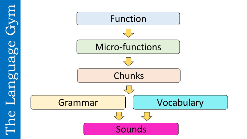 - Grammar is not the end goal of instruction but a tool to support the achievement of spontaneity and creativity with the language: it serves a communicative purpose. As picture 3 above shows, it is selected based on the Communicative functions we teach and, more precisely, on the construction(s) which convey that function. For example, in teaching the function “Describing what one did last weekend” in French, I may choose to teach the construction: Time marker + Perfect tense of Aller + prepositional phrase. C’était + adjective. As a result, I will decide to teach the perfect tense of aller. This means that the target grammar structure emerges organically from the context; it is learnt in context. The grammar explanation occurs as a way to give the target construction more generative power, i.e.: teach the learners how to manipulate it using declarative knowledge so that they have control over it and doesn’t stay a monolytical unanalysed chunk of language. In other words, declarative knowledge is taught in order to build on procedural knowledge.