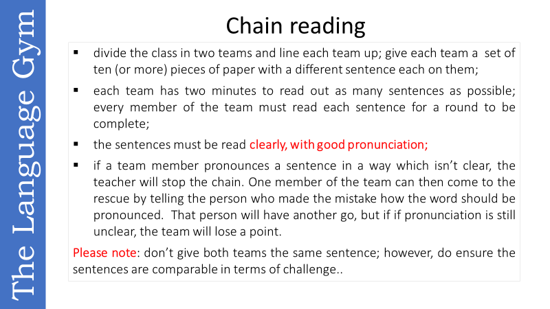In the Structured Production phase, prior to the Chunking aloud games typically staged with beginner to pre-intermediate classes, another short pop-up phonics session may occur to sensitize and prime the students, in which you would stage phonological awareness classics such as ‘Minimal pairs’, ‘Phonemes bingo’, ‘Contrast and response’, ‘Rhyming pairs’ and others detailed in this post . During each chunking-aloud game you will of course walk around monitoring student output, correcting when necessary and making mental notes of the most common mistakes. After each game, you will use the so-gathered observational data to provide whole-class feedback on their decoding skills, before the students proceed to play the next activity. For some EPI classic chunking aloud games, follow this link.