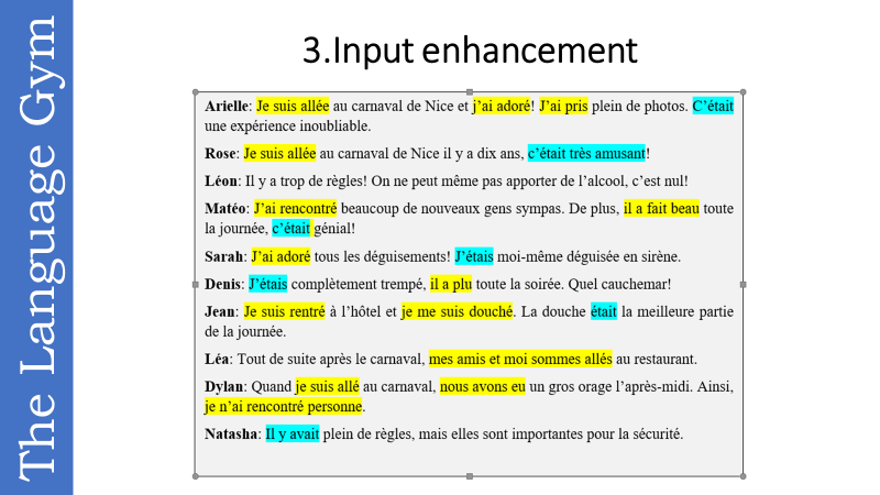 Input-flooding and input-enhancement work in synergy in an attempt to draw the learner attention to the target linguistic features. In the example in figure 3 below, for instance, the text is flooded with French perfect tense and imperfect forms which have been highlighted in yellow and blue.