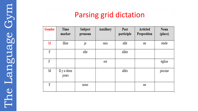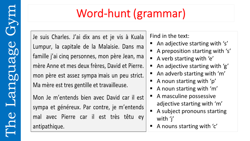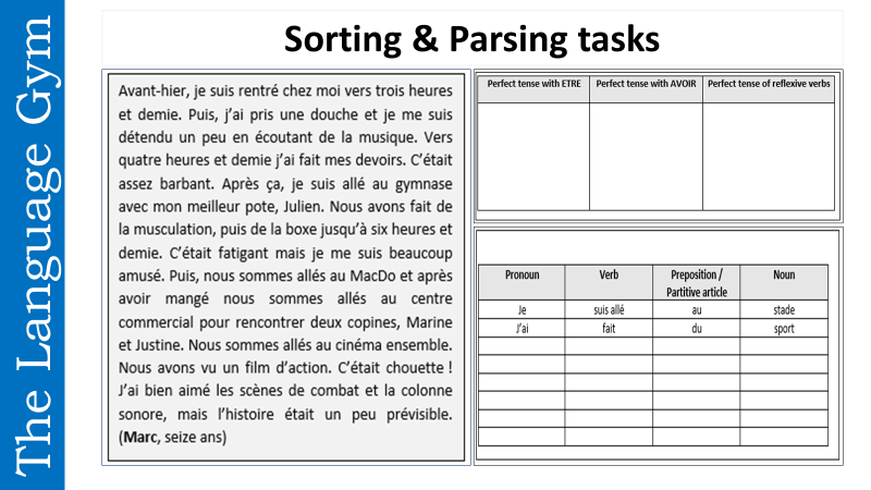 Grammar is also learnt explicitly, through activities which deliberately direct the learner’s attention to the target features (see figures 5 to 8 below). For instance, in a lesson on ‘Talking about last week-end’ in French, the auxiliares AVOIR and ETRE may be gapped from a text which needs to be filled in by the students as part of a partial dictation. Or, as part of a ‘Faulty transcription’ task, the students may be asked to correct wrong instances of the perfect tense occuring in a text similar to the one used in the partial dictation. In a ‘Tracking’ listening activity, the students may be asked to note down how many instances of AVOIR and ETRE they hear in an aural text flooded with perfect tenses read aloud at moderate pace.