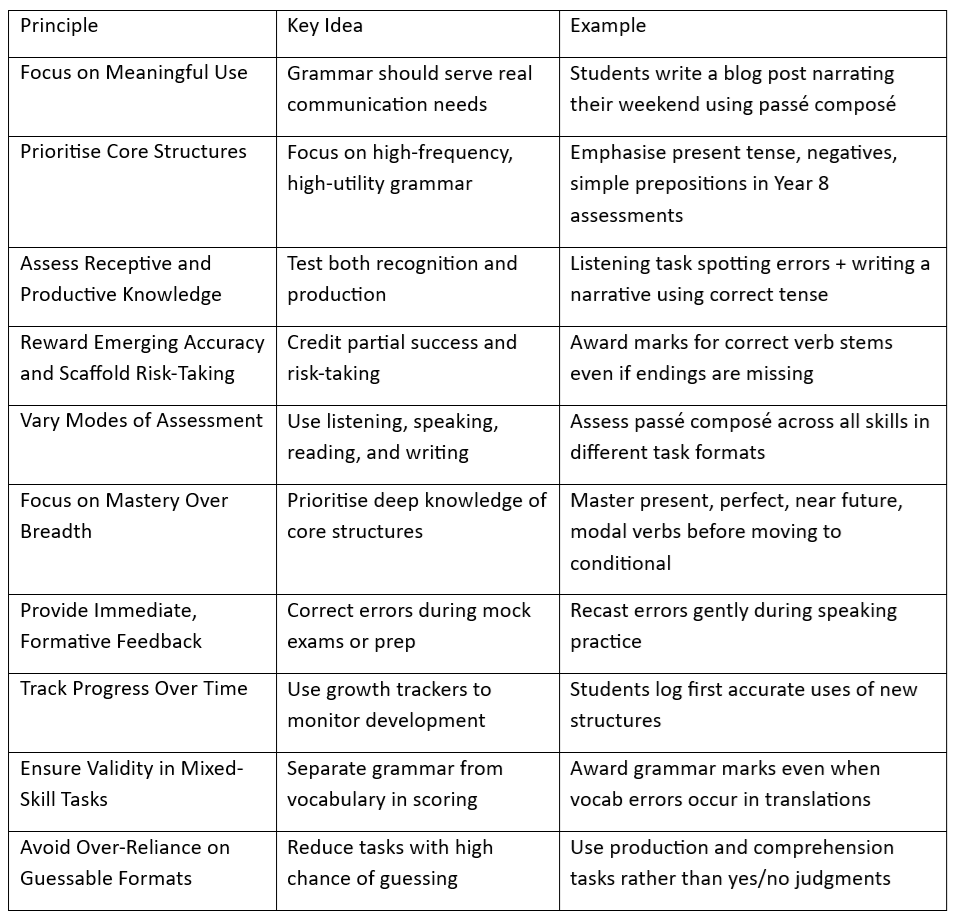 When it comes to assessing grammar in a Modern Foreign Language (MFL) classroom, especially with beginner to intermediate learners, it should be much more than just ticking boxes. Grammar learning is messy, gradual, and happens best through real use—not through artificial drills. Good grammar assessments need to reflect how languages are actually acquired. After all, in real communication, we use grammar to tell stories, explain ideas, argue our points—not just to get full marks on a worksheet. In this article, drawing on some of the most trusted research in second language acquisition (SLA) and cognitive psychology, we’ll walk through 10 key principles that can help make grammar assessment in MFL classrooms more meaningful, motivating, and effective.