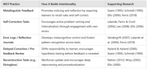 Planned feedback aligns with long-term instructional goals rather than being merely reactive. VanPatten (2004) and Swain (1995) stress the need for integrating feedback within structured learning cycles. When feedback is anticipated and followed up by recycling and revision tasks, learners process it more deeply (Ferris, 2018).