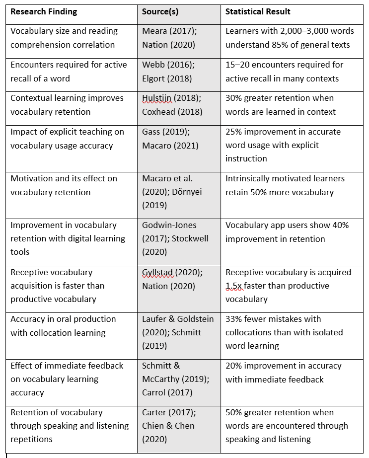 When vocabulary is taught explicitly—rather than left to be inferred through exposure—learners show a 25% improvement in accuracy. This includes clear explanations of meaning, form, grammar, pronunciation, and common collocations.