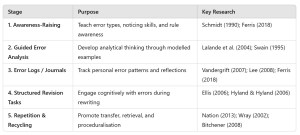 In essence, intentional engagement in the feedback process is the foundation of long-term success. As students learn to understand and work through their mistakes with clear, structured, and manageable feedback, they develop greater autonomy and become more effective communicators. This holistic approach not only improves written proficiency but also contributes to a sustainable, self-regulated language learning process.