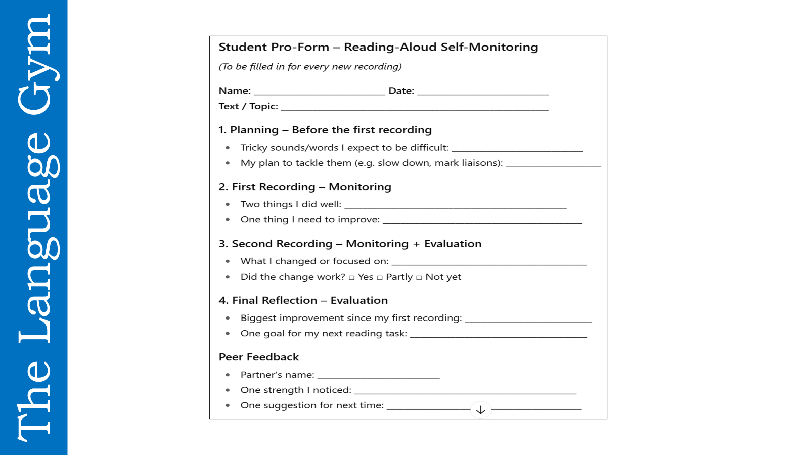 Self- and peer-evaluation (Monitoring + Evaluation) Students listen back to both their own and their partner’s second recordings. They complete the pro-forma, noting improvements and remaining issues.