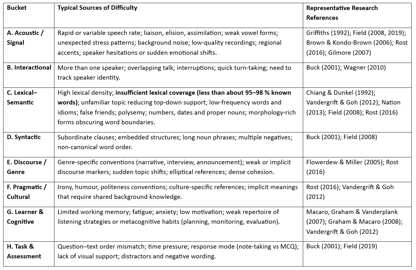 Use the eight buckets as a difficulty checklist whenever you select or write a text. Decide which factors will probably trip up your learners and plan support in advance—perhaps pre-teach key chunks (Webb & Nation, 2017), run a short phonology warm-up, or model turn-taking signals.