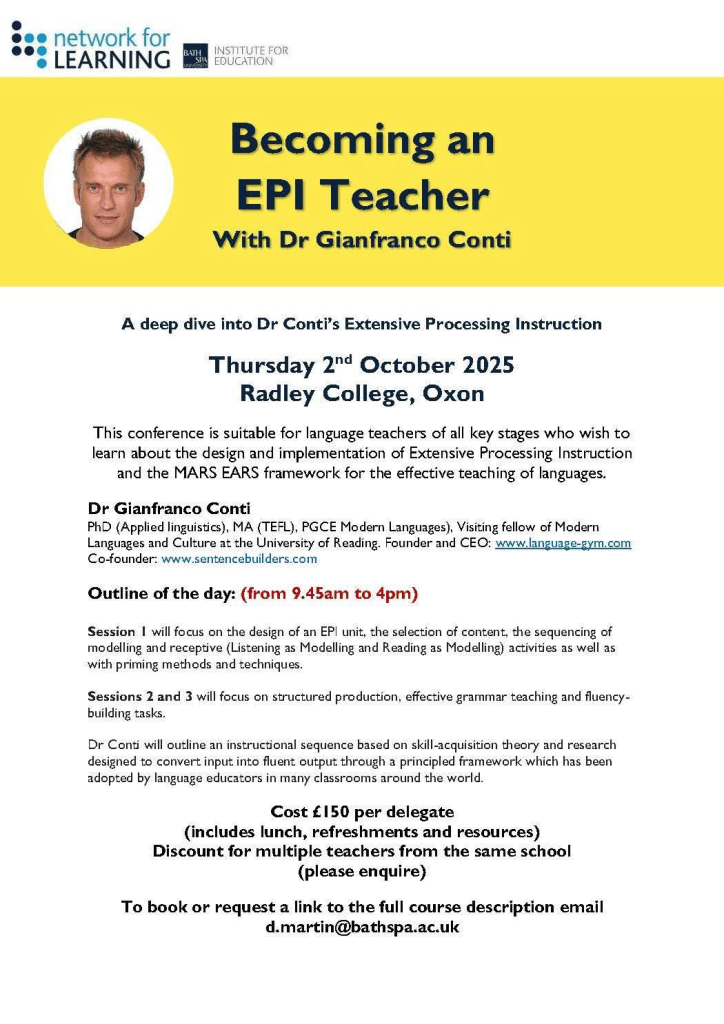 by Gianfranco Conti, PhD. Co-author of 'The Language Teacher toolkit', 'Breaking the sound barrier: teaching learners how to listen', 'Memory: what every teacher should know' and of the 'Sentence Builders' book series. Winner of the 2015 TES best resource contributor award, founder and CEO of www.language-gym.com, co-founder of www.sentencebuilders.com and creator of the E.P.I. approach.